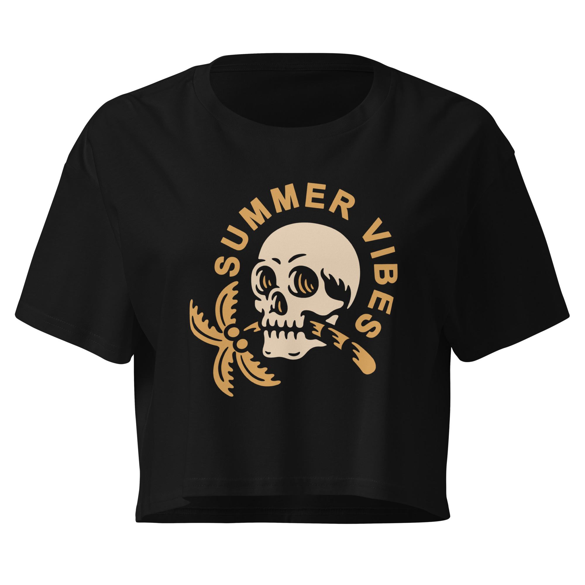 Le design associe un crâne stylisé avec un élément tropical, accompagné du message “Summer Vibes”. Un visuel simple, facile à comprendre, qui fonctionne immédiatement.