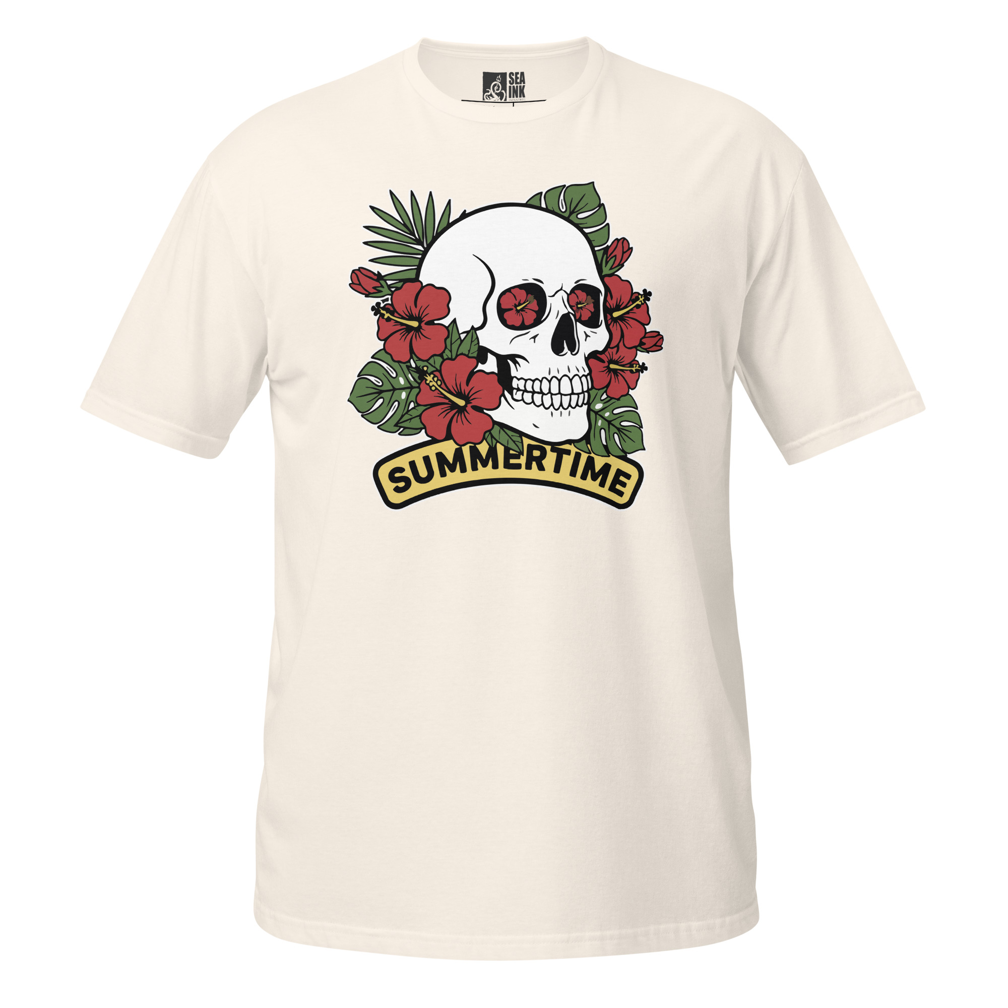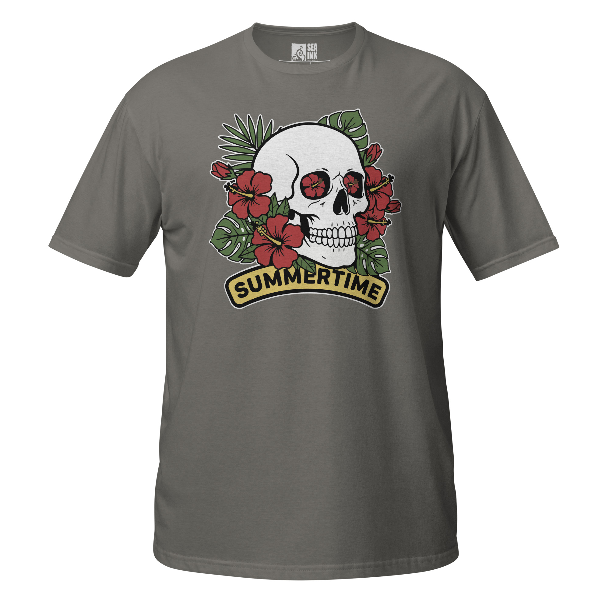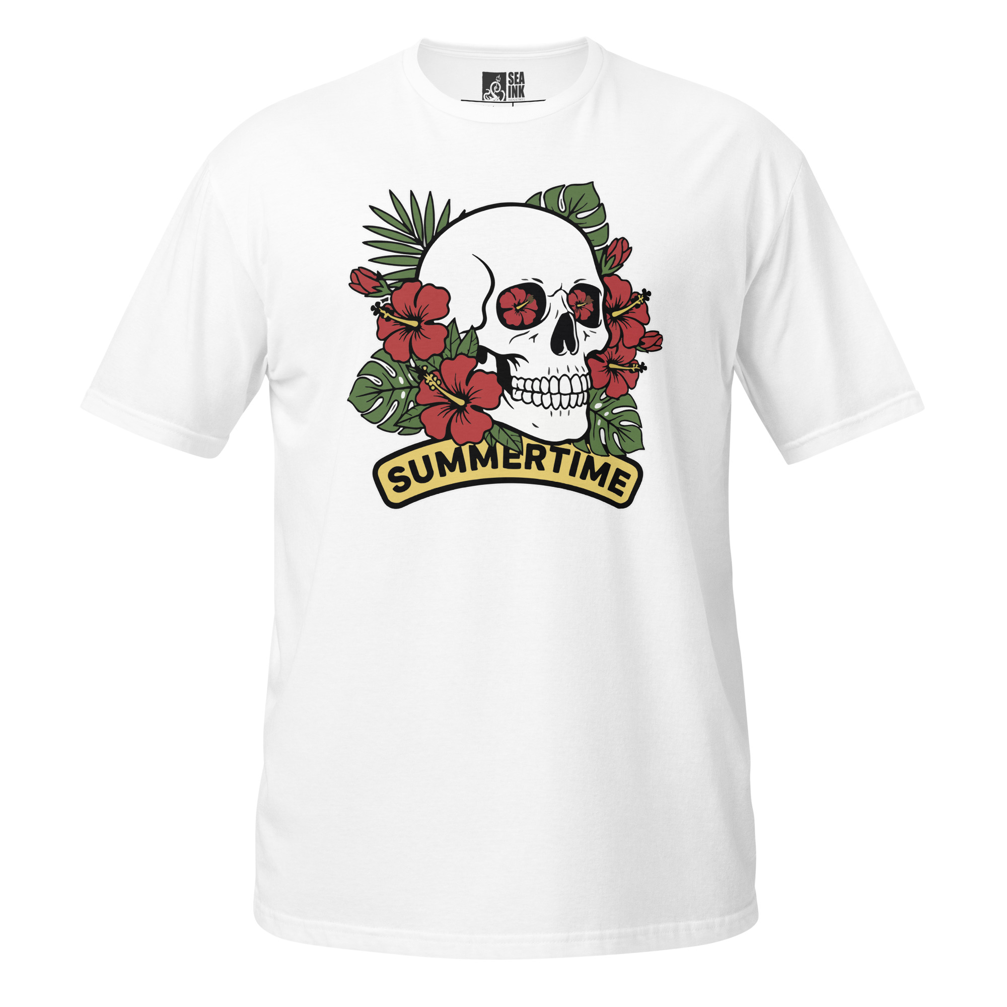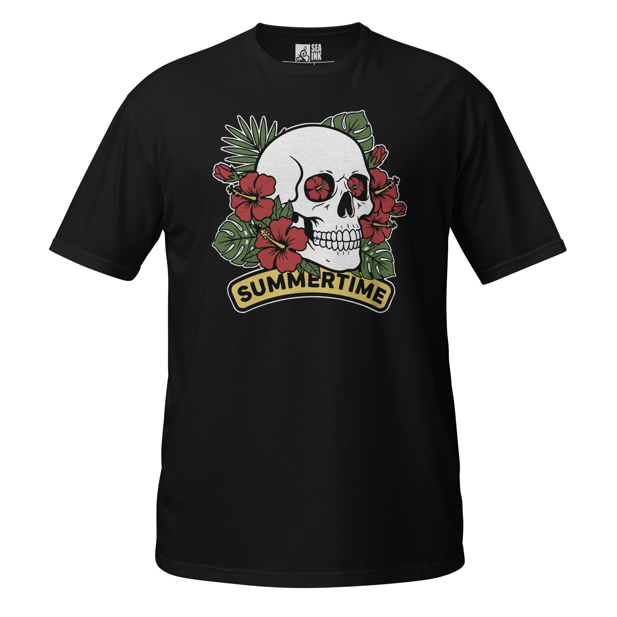 Le design met en avant un crâne entouré de fleurs exotiques, avec le message “Summertime”. Un visuel simple, équilibré, qui mélange parfaitement ambiance estivale et touche grunge légère.